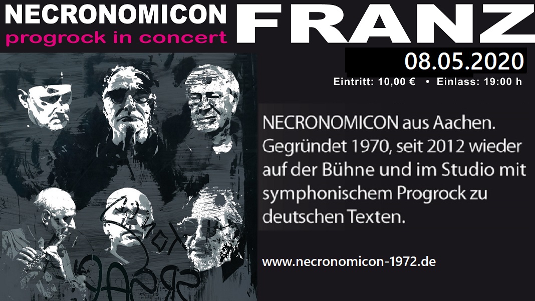 Concert and Video History:Friday, 18.01.2019, concert in the "Franz" in Aachen, list of YOUTUBE videos of the concert June 2017: Presentation of the Aachen ProgRock-Band Necronomicon. Friday, 31.03.2017, concert in the "Franz" in Aachen, During the finale of the 34th German Rock & Pop Preis on Dec. 10, 2016 in the Siegerlandhalle in Siegen, NECRONOMICON won the 1st price in the category "Best Progressive Band" with their recent song "Verwundete Stadt (Wounded City)". Saturday, 23. January 2016, Concert in the SPACE of the Ludwig Forum Aachen, Introduction of the new Double Vinyl LP "NECRONOMICON LIVE in Concert 1973"In 1973 the director of the art gallery "Neue Galerie - Sammlung Ludwig", Dr. Wolfgang Becker, invited NECRONOMICON for a concert during an art exhibition of the New York artist Ben Schonzeit. The concert was recorded on a stereo tape which was forgotten during the next years and decades. Only in may 2014 the tape was rediscovered in the archives of the Aachen Ludwig-Forum of modern art. The quality of the recording was surprisingly good. Thus, NECRONOMICON decided to publish this 40 year old document on a double vinyl LP